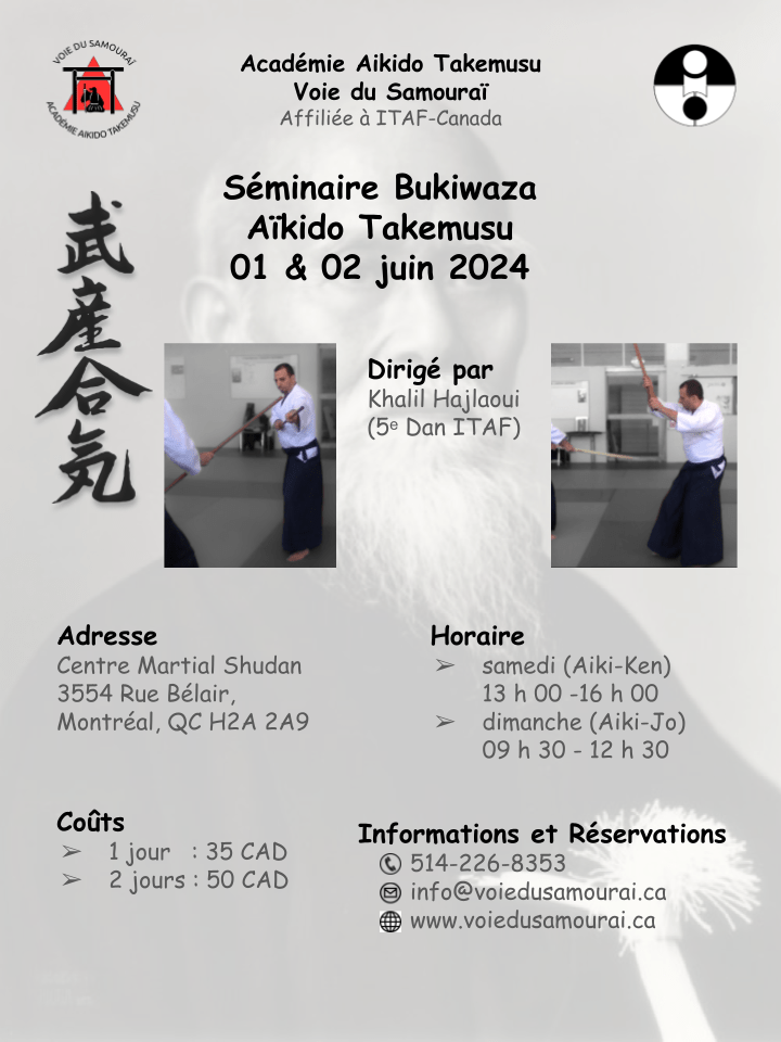 Mise à jour : Suite aux conditions climatiques, le séminaire Bukiwaza (Aiki-Ken & Aiki-Jo) pour adultes sera déplacé au Dimanche 16 mars 2025 au Centre Martial Shudan.