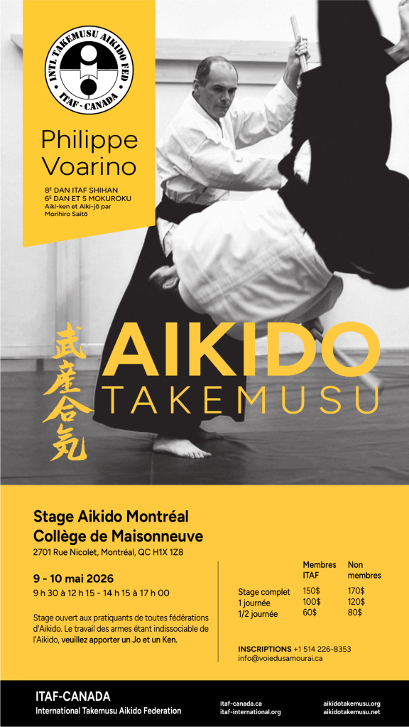 From May 9 to 10, 2026, ITAF-Canada will present for the first time in Canada a major international Aikido Takemusu seminar at Collège de Maisonneuve in Montreal, under the exceptional direction of sensei Philippe Voarino (8th dan ITAF, Shihan).